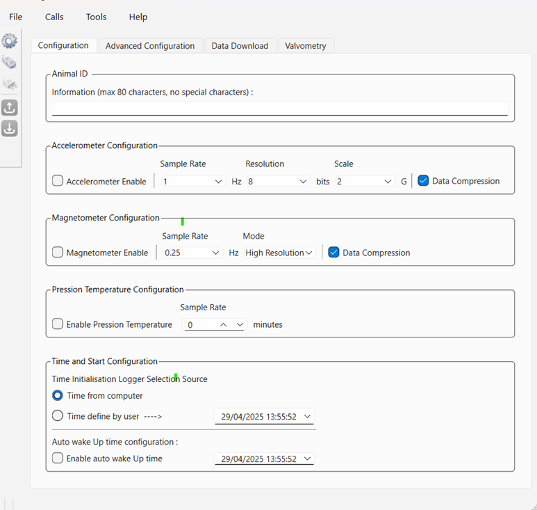 Exemple de GUI pour la configuration, la récupération des données logger et test des capteurs onboard.
